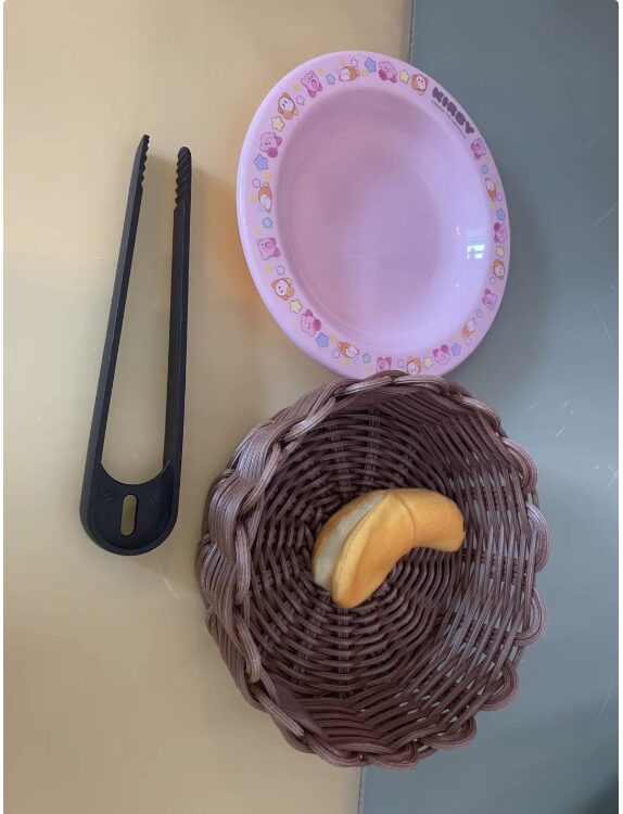 [左側] 布製おもちゃが入った器 [中央] トング [右側] 空の器